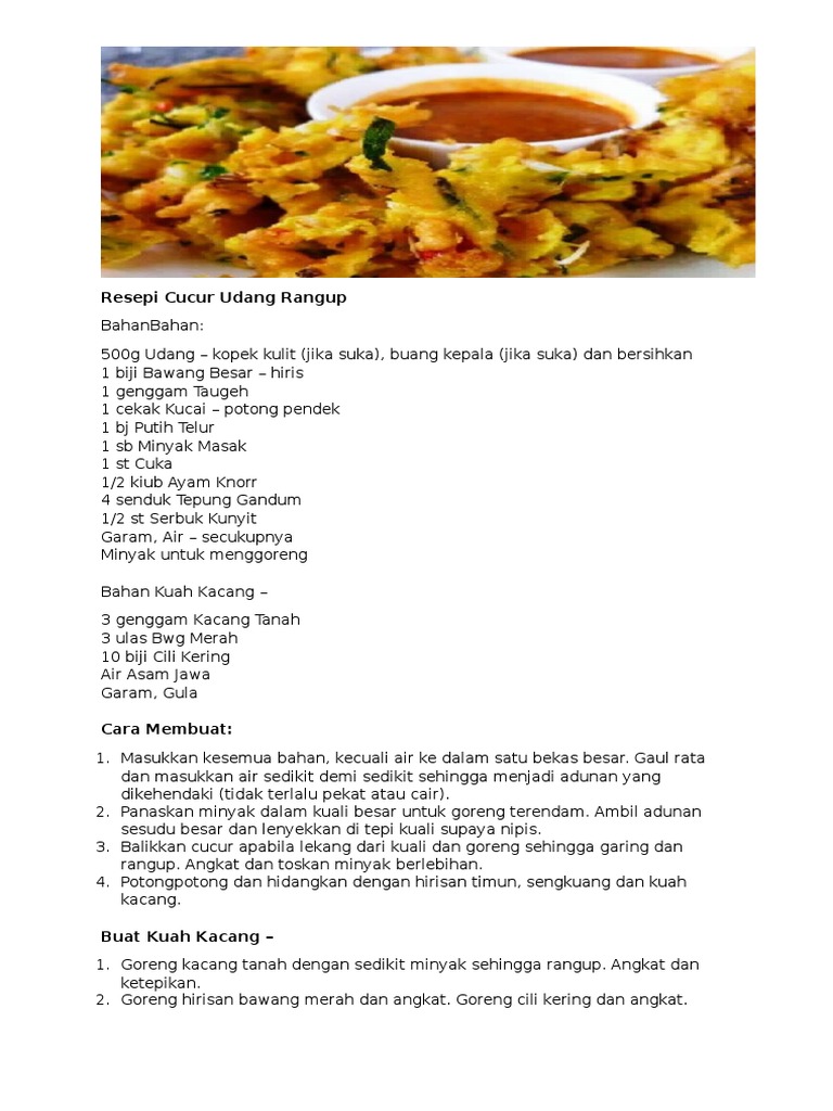 Memang best kan resipi cucur udang garing bila dicicah sos cili atau kuah kacang. 1 Teh serbuk kunyit. Bahkan resepi yang dikongsikan.